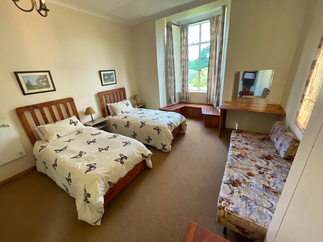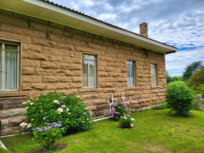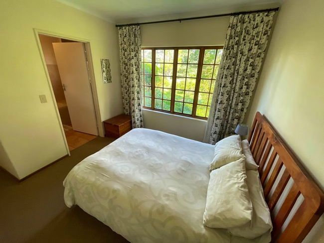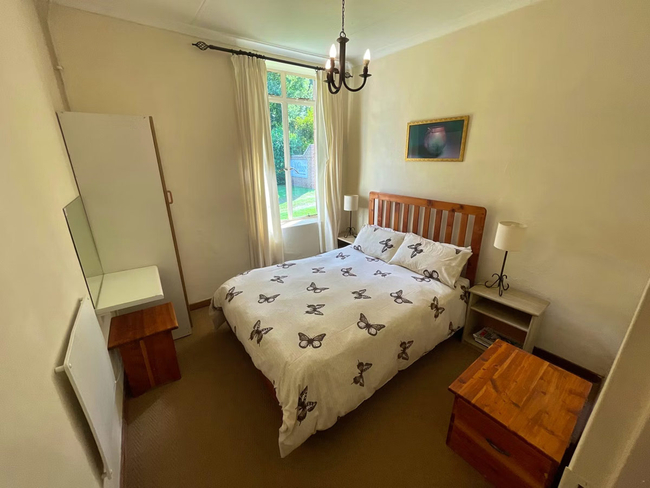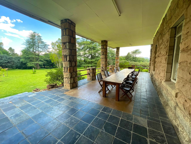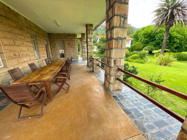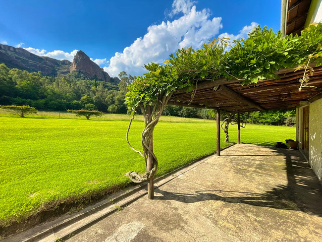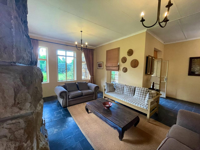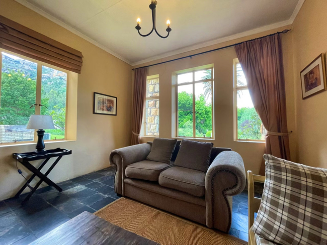 This cottage sleeps 8 guests and comprises 4 bedrooms, 4 bathrooms, a kitchen, and a living area. The main and second bedrooms each contain 2 single beds. The main bedroom’s en-suite bathroom is fitted with a bath, shower, toilet and washbasin and the second bedroom’s en-suite bathroom is fitted with a shower and toilet. Both the third and fourth bedrooms are furnished with a double bed. The third bedroom’s en-suite bathroom has a shower, and the fourth bedroom’s en-suite bathroom has a bath. The kitchen is equipped with a fridge, oven, gas stove, microwave, basic cutlery and crockery, as well as tea- and coffee-making facilities. There is also a dining table with chairs where guests can enjoy their meals together. The living area is furnished with couches and a fireplace. There is a spacious verandah where guests can enjoy the breathtaking views of the mountains in the background.