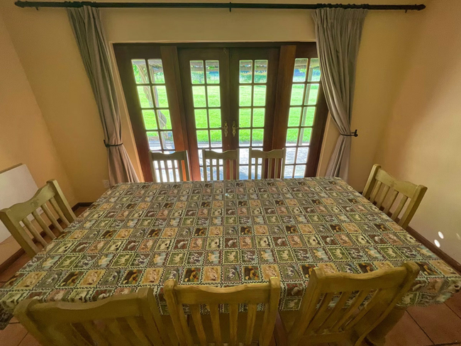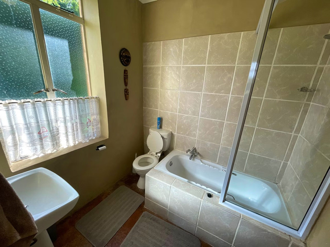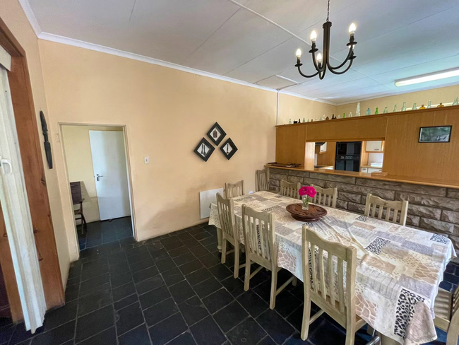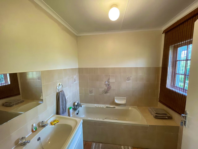 This house can accommodate up to 10 guests and comprises 5 bedrooms, 5 bathrooms, a kitchen and a living area. The main and second bedrooms are both furnished with a double bed and feature en-suite bathrooms fitted with a shower, toilet and washbasin. Both the third and fourth bedrooms contain 2 single beds each and feature en-suite bathrooms fitted with a shower and toilet. The fifth bedroom has 2 single beds and 1 child-only couch for 1 guest, the fifth bedroom’s en-suite bathroom is fitted with a shower-over-bath, toilet and washbasin. The kitchen is equipped with a fridge-freezer, oven, stove, microwave, basic cutlery and crockery, as well as tea- and coffee-making facilities. There is also a dining table with chairs. The lounge is furnished with couches and a fireplace. The spacious verandah has a long outdoor dining table with chairs. Guests also have access to outdoor braai facilities.