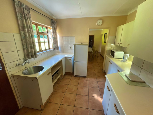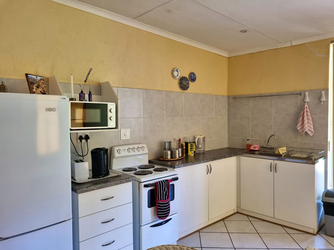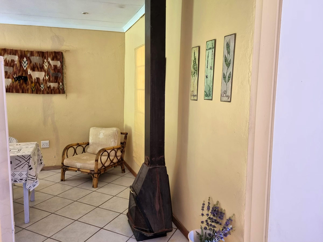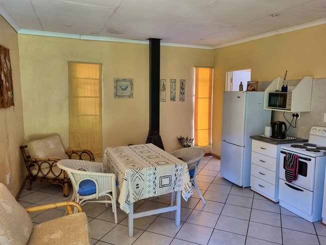 This chalet can accommodate 2 guests and comprises 1 bedroom, 1 bathroom, a kitchen and a living area. The bedroom contains 2 single beds and features an en-suite bathroom fitted with a shower, toilet and washbasin. The open-plan kitchen is equipped with a fridge-freezer, oven, stove, microwave, basic cutlery and crockery, as well as tea- and coffee-making facilities. There is a small dining table with chairs and extra seating, as well as a fireplace. The sliding doors lead out to a verandah which has outdoor furniture and braai facilities.
