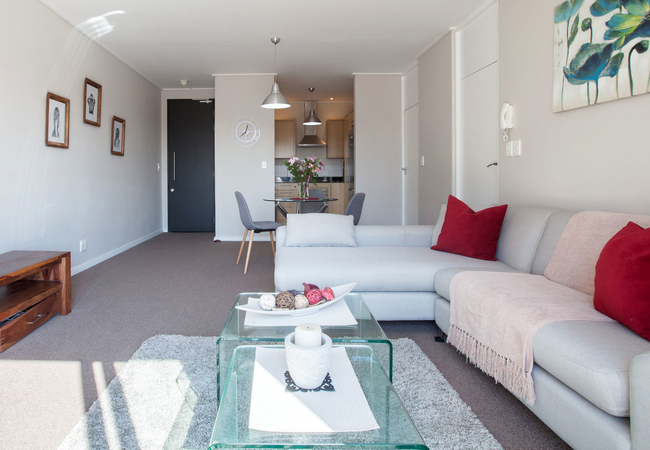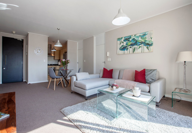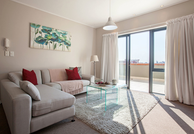 The spacious and modern apartment has one bedroom furnished with a Queen-size bed. The bedroom has sufficient cupboard space and leads, through sliding doors onto a balcony. There is a separate bathroom with both a bath and shower.
