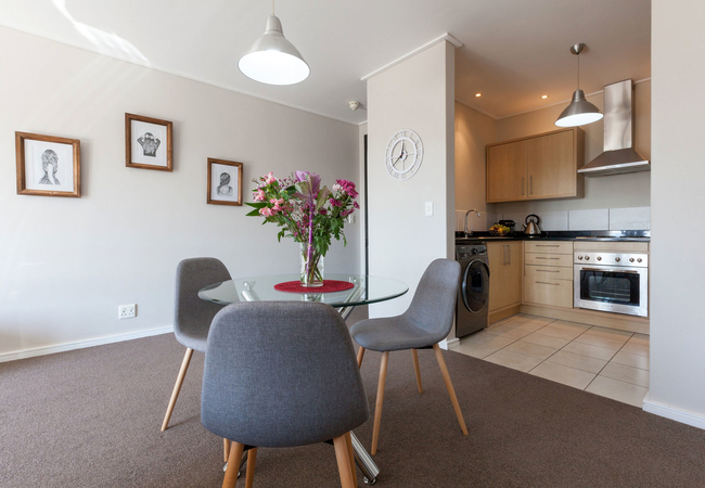 There is a fully equipped kitchen complete with a fridge, microwave, kettle and Nespresso machine. There is also a washer / drier combo and a built in oven and hob. The kitchen area flows into an open plan living and dining area. The living room has a TV with Netflix and Wi-Fi. It opens onto the balcony which boasts views of the Durbanville Winelands and Plattekloof Hills.