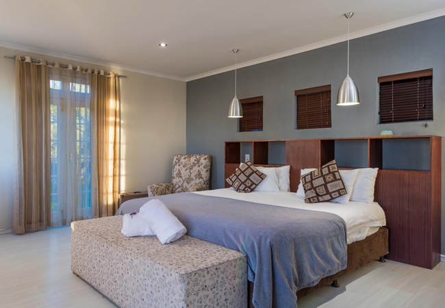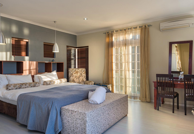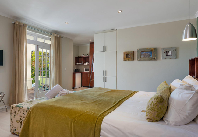 Double Room overlooking pool and gardens have small kitchenette and verandahs. All rooms have modern conveniences i.e. safes, computer links, hairdryers, mini-bars, TV with M-Net and Satellite TV, air-conditioning and some with fire-places. Extra luxuries include toiletries, pure cotton linen, gowns, pool towels and laundry services. There is secure off-street parking for guests.