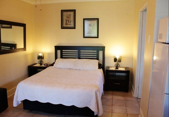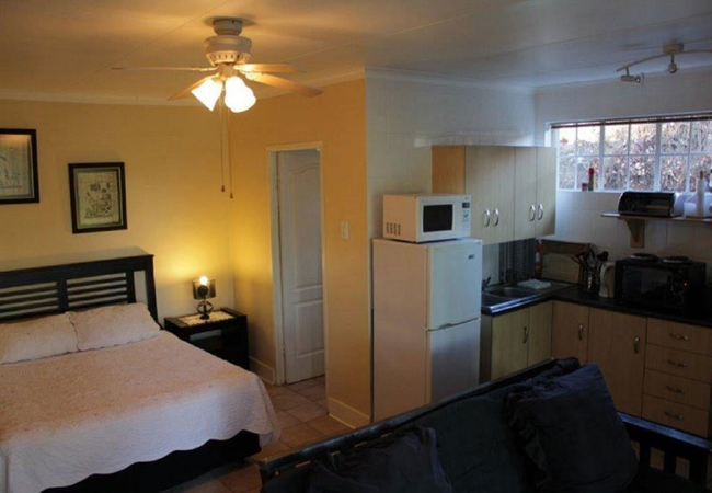 This unit has one room laid out as an open-plan bedsitter / kitchenette with King-size bed or two single beds and an en-suite bathroom with spa bath. The unit has a fully equipped kitchenette, a TV with DStv / satellite channels and Wi-Fi.