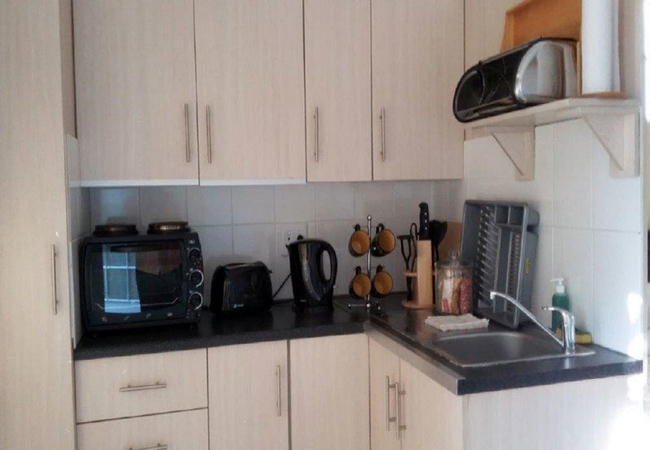 This unit has one bedroom furnished with a queen-size bed and one extra single bed. There is an en-suite bathroom. The unit has a fully equipped kitchenette, a TV with DStv / satellite channels and Wi-Fi.