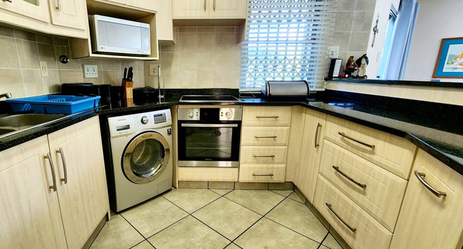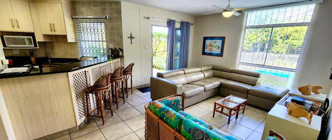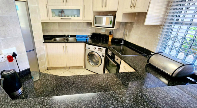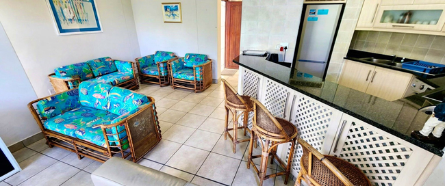 The kitchen is fully equipped for self catering and includes a washing machine, microwave, fridge, stove, and a breakfast counter with three bar stools. The open plan lounge opens onto a patio where partial sea views can be enjoyed, providing a pleasant space to unwind. The lounge is comfortably furnished with seating for six guests and includes a flat screen television with full DStv.