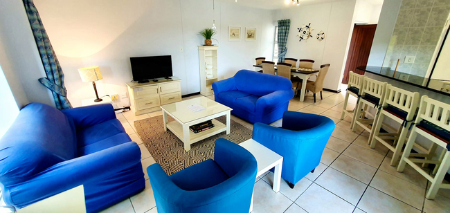 The fully equipped kitchen includes a washing machine, tumble dryer, microwave, refrigerator, and stove, complemented by a practical breakfast counter with four bar stools. The open plan lounge and dining area provide comfortable seating for six guests and are fitted with a flat screen television offering limited DStv channels, along with unlimited WiFi access.