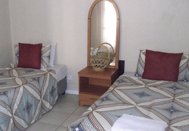 The Self-catering Apartment has four single beds and a bathroom with a shower. There is a living area with a TV with open view channels. The kitchen has a dining table and contains a microwave, fridge, two plate stove, crockery and cutlery.