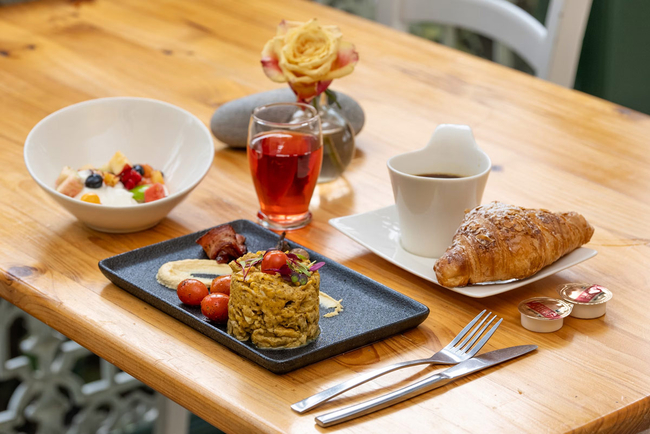 Each morning, guests are treated to a gracious breakfast served in an elegant dining area, which opens onto a wide verandah with views across the lush garden and sparkling swimming pool.