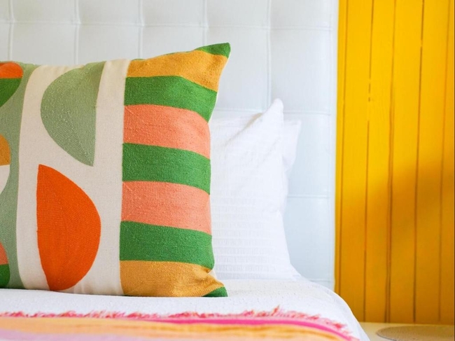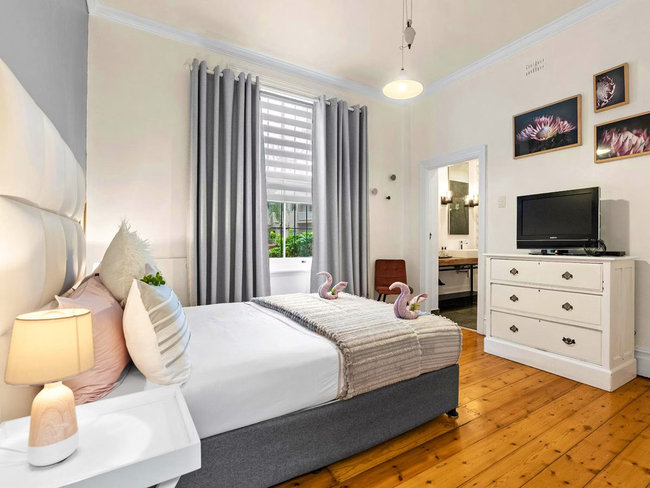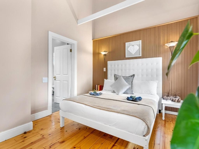 The villa’s French doors open onto a peaceful courtyard lined with citrus and olive trees. Shared spaces throughout the property are thoughtfully curated with original artworks, polished Oregon pine floors, and authentic antiques, lending a refined yet welcoming atmosphere.