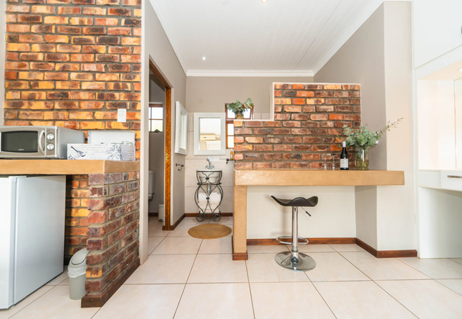 A lovely cosy and private room if you're looking for a quiet space where you need to work or simply want to chill without any disturbance. Beautiful very private patio where you can relax with your sun-downer and a good book. The room is furnished with a Queen size bed. The bathroom is equipped with a shower, hand basin and WC. Each suite and self-catering unit is equipped with a fully stocked bar fridge for your convenience. Coffee and tea facilities are available as well and also fresh homemade rusks.