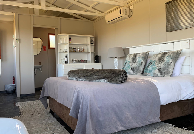 Kamer 5 is a secluded unit offering complete privacy with stunning views across the valley. The room is furnished with a Queen size bed. The bathroom is equipped with a wet shower and open bath with a beautiful view of the farmlands. This room does not have a television. Each suite and self-catering unit is equipped with a fully stocked bar fridge for your convenience. Coffee and tea facilities are available as well and also fresh homemade rusks.