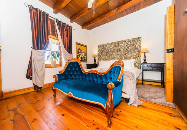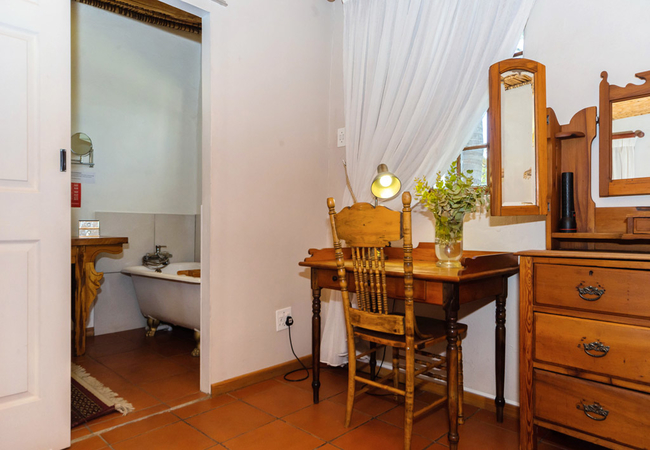 Located in the main house, Voorkamer is a traditionally decorated suite furnished with twin beds (please request King bed if preferred). The full bathroom is equipped with a bath and shower, hand basin and WC. Colour television offering DSTV guest house bouquet. Each suite and self-catering unit is equipped with a fully stocked bar fridge for your convenience. Coffee and tea facilities are available as well and also fresh homemade rusks. Televisions are standard in all suites and include all local channels as well as MNet and DSat.