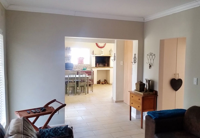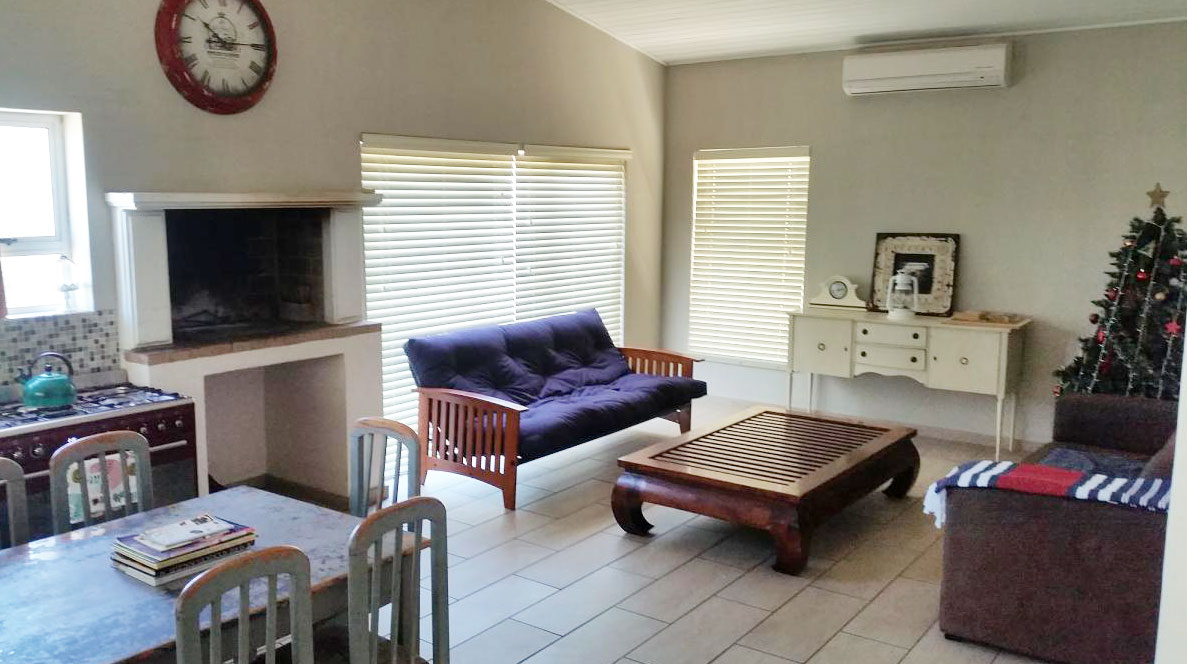There is an open plan, air conditioned living area, a separate TV room (with DStv) as well as a braai / entertainment room. The lounge has a fireplace for chilly winter nights and there is a dining table and chairs for family meals.