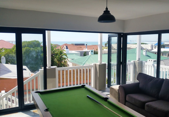 The house is comprised of three bedrooms. The main bedroom opens, via double doors, onto a balcony which has sea views. This room is furnished with a King-size bed. The second bedroom has a double bunk bed and the third bedroom has a Queen-size bed. The is an en-suite bathroom and another separate bathroom. There is an open plan, air conditioned living area, a separate TV room (with DStv) as well as a braai / entertainment room. The lounge has a fireplace for chilly winter nights and there is a dining table and chairs for family meals. The kitchen is fully equipped for self catering and includes a gas stove and oven. Guests can admire the beautiful views from the braai room and lookout deck on the roof. The entertainment area is equipped with a pool table to enjoy while you braai.