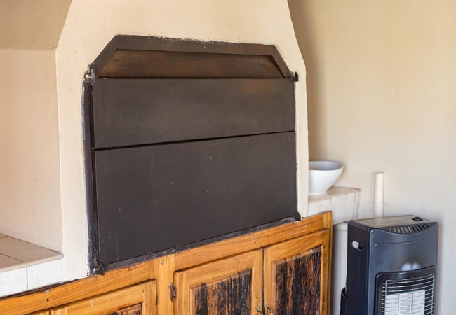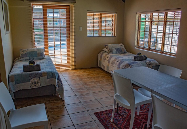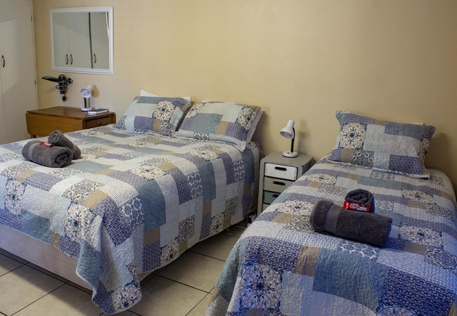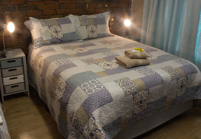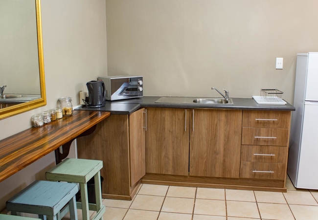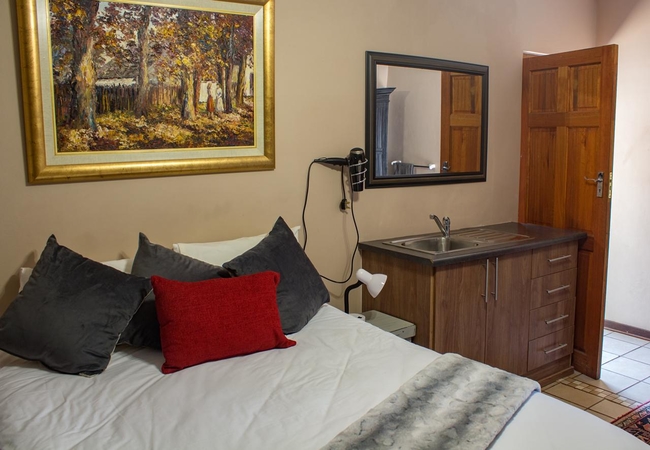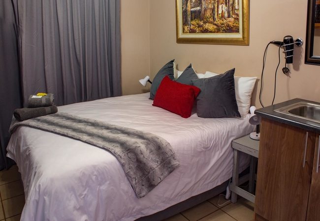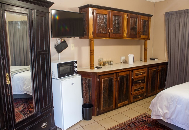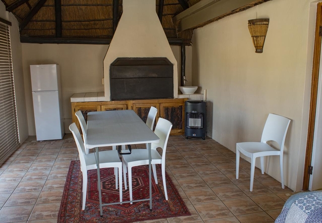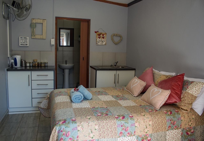 This room is furnished with a Queen size bed. Facilities in the room include Kettle, Microwave oven, Bar Fridge, cutlery and crockery for each guest. Tea, Coffee and sugar are provided. Braai facility is available. Guests are responsible to provide own wood. TV. Soap, towels. Ironing board and iron.