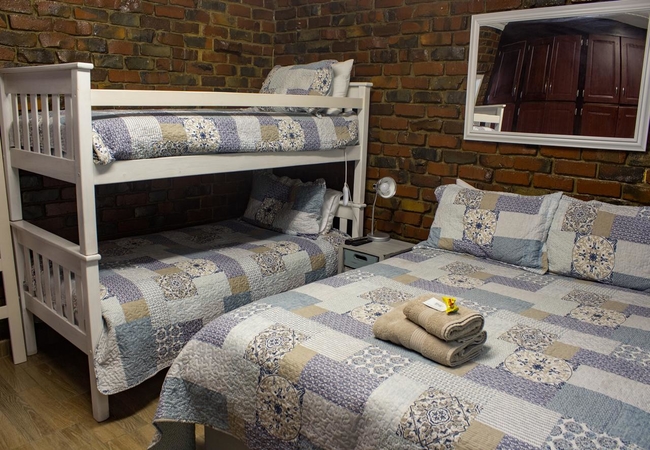 The Family Room is furnished with a Queen and double bunk beds. Facilities include Flat Screen TV, kettle, microwave, hotplate, toaster, bar fridge, cutlery and crockery, hair-dryer, iron, tea, coffee, sugar, milk. Braai facility (Guests buy own wood).