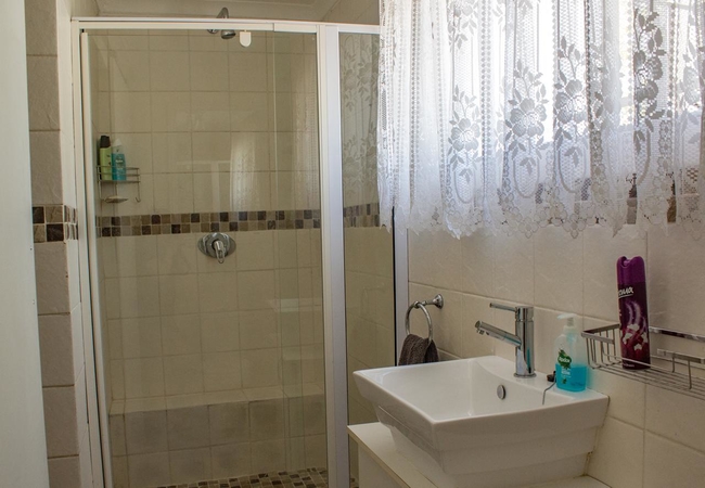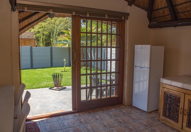 Family Room with Patio and Shower has one bedroom and enclosed lapa with built-in braai. One bathroom with shower. Sliding door gives access to a patio and enclosed lawn. Queen bed, three single beds and two comfortable camping beds. TV, tea tray, kettle, hotplate, pots, toaster, hairdryer, etc.