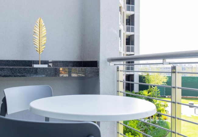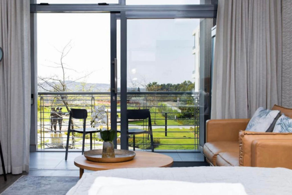 Menlyn Maine 101 is a studio apartment furnished with a Queen-size bed. The bathroom is fitted with a shower, bidet, toilet, wash basin and complimentary toiletries. The kitchen is fully equipped for self catering. There is a comfortable lounge that is equipped with a smart TV and Netflix. The living area leads onto the patio which has lovely views of the area. The complex has a 24 hour front desk, secure parking, a shared swimming pool, restaurant and Wi-Fi.