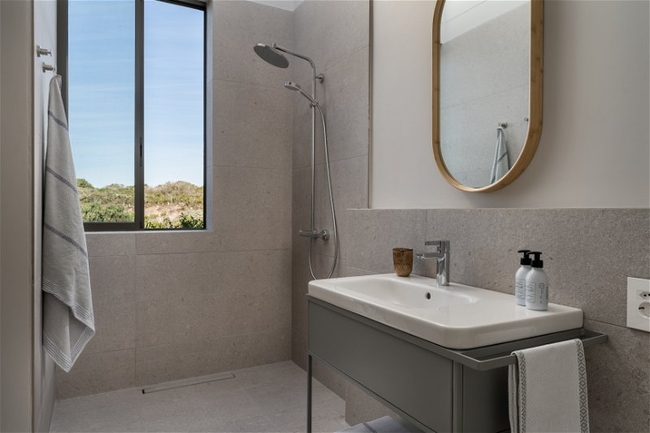 Romansbaai’s most striking feature is its setting, a sweeping coastal expanse offering 270-degree ocean views and direct access to an exclusive white sand beach. The water here displays a turquoise hue more commonly associated with island destinations, and the sunsets across the bay are nothing short of spectacular. Owing to its north-facing orientation, the estate enjoys protection from the Cape’s dominant summer winds, offering calm conditions both at the beach and at the residence.