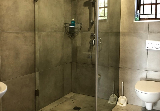 The lounge has seating and a flat screen TV with selected DStv channels. The kitchen has a breakfast bar with stools where you can enjoy your meals and is fully equipped with a counter top oven and two plates, a fridge / freezer, microwave, kettle, crockery and cutlery.