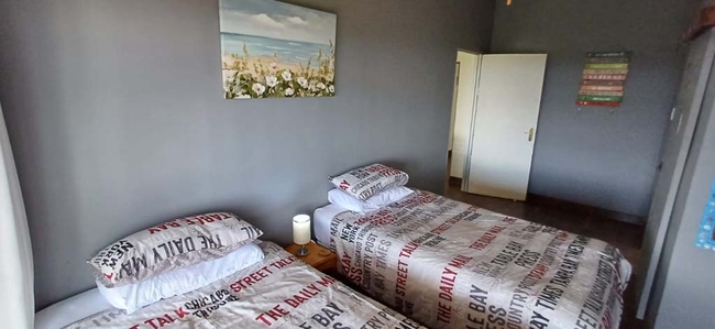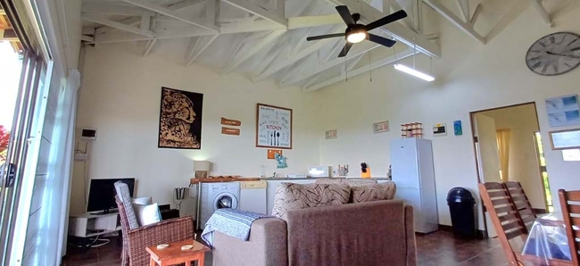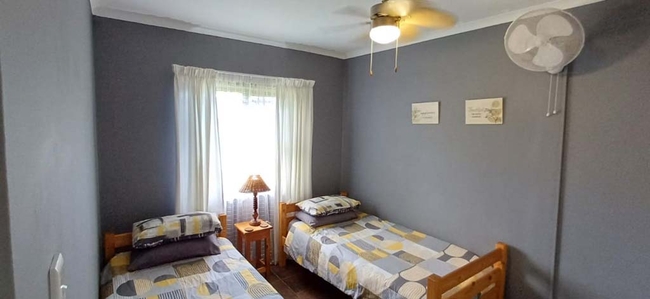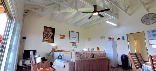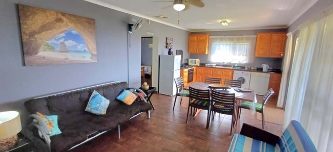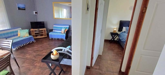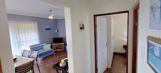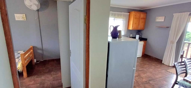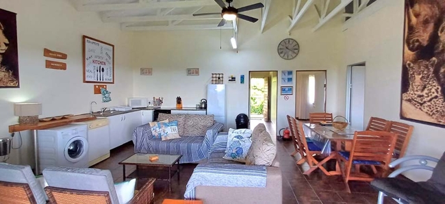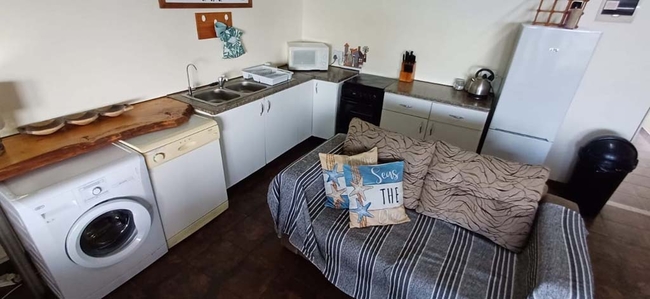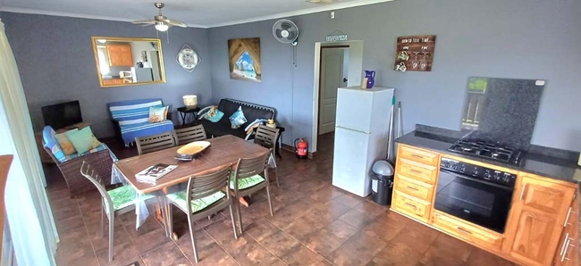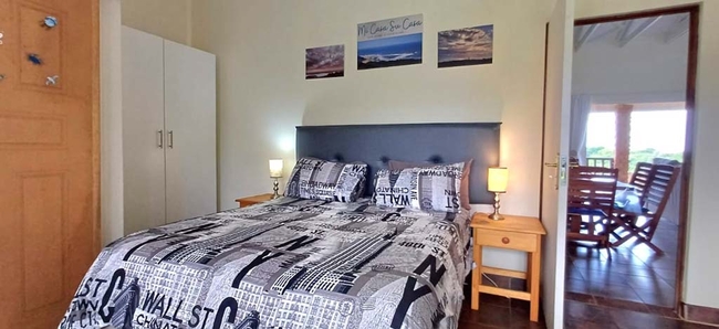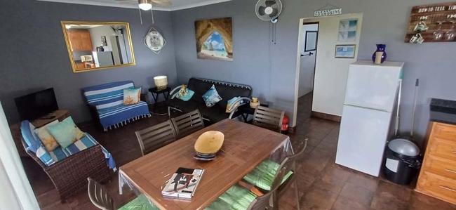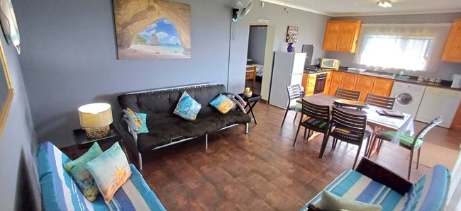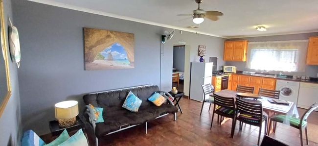 Su Casa 2 is open-plan and has two bedrooms with ceiling fans. The first bedroom bedroom is furnished with a Queen-size bed. The second room has two single beds. The bathroom is fitted with a shower, toilet and basin. Bedding and bath towels are provided, please bring your own beach towels. The kitchen has a fridge, gas stove, dishwasher, washing machine, microwave, kettle, crockery and cutlery. The dining room has a dining table and the lounge has a comfortable lounge suite and a sleeper couch. Outside is a veranda with a Weber braai. The sea is within view from the dining room and veranda.