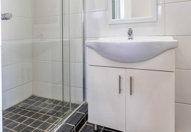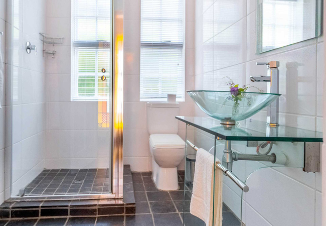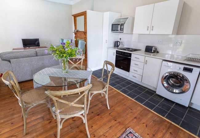 Cottage One has an open plan living, dining and kitchen area plus a scullery, compact with French doors opening onto the covered porch - allowing for outdoor eating if preferred. This two-bedroom apartment has intimate light colors to promote tranquillity. All bedrooms are en-suite with a shower. The main bedroom has an extra length King-size bed which can convert into two single beds if preferred. The second bedroom has a Queen-size bed. The scullery, with granite tops, is very spacious and provides a separate area for food preparation but is neatly tucked away behind French doors to hide the clutter of cooking. The kitchen is fully equipped and includes a fridge, stove, microwave oven and washing machine for private use. Our service, however, includes washing and ironing of bed linen and towels in a separate linen room.