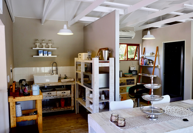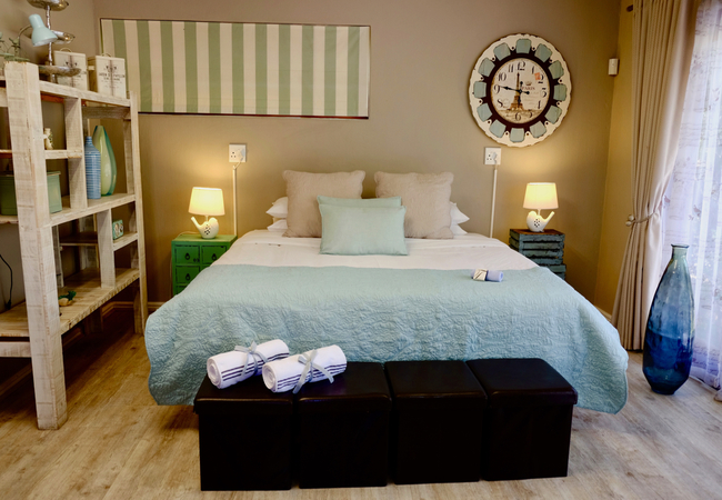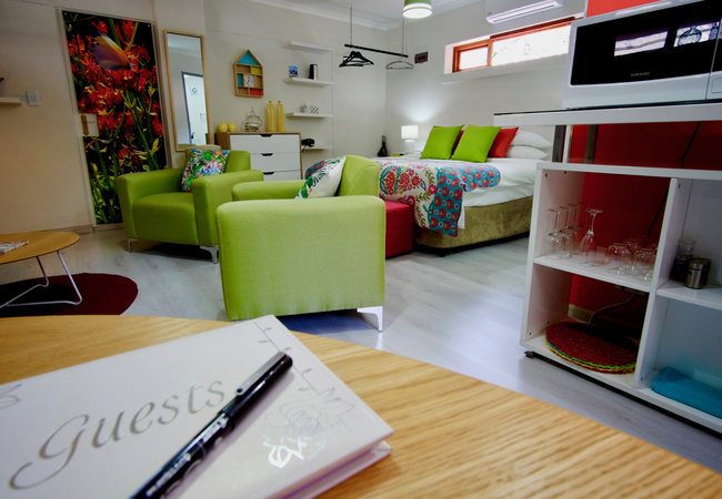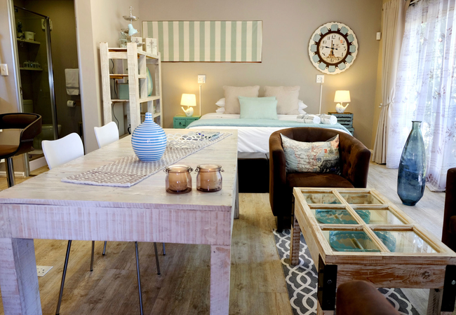French Whisper is a spacious studio apartment with air-conditioning on the first floor surrounded by greenery and tranquil surroundings and comprises an open-plan living area with twin beds or a king-size bed, an en-suite bathroom that has a shower (no bath), basin and toilet. Adjacent to the bedroom area is a dressing room with a full length mirror, hair dryer and ample space for clothing. The equipped kitchenette is fitted with a basin, microwave, small fridge, kettle and coffee and tea station. The comfortable lounge area has a flat-screen TV with DStv viewing and the dining area has a large table to enjoy meals and also provides ample work space for the executive. Free Wi-Fi internet access is available.