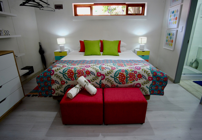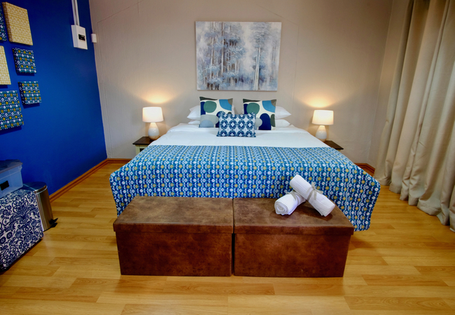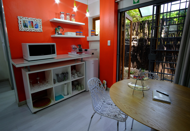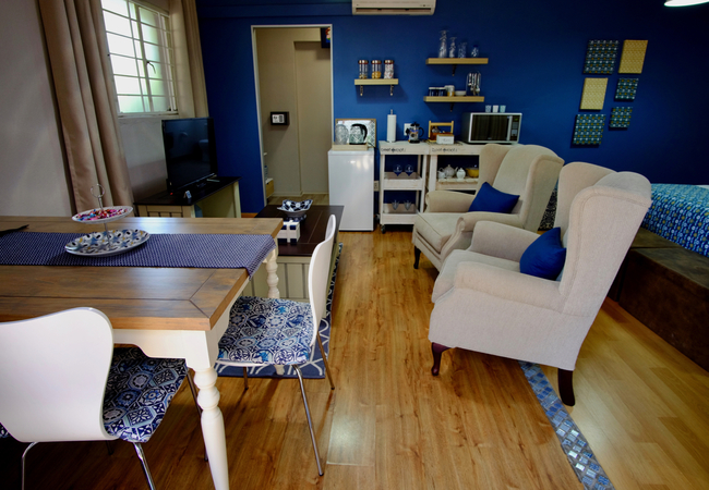 Blue Bell is a spacious studio apartment with air-conditioning on the ground floor surrounded by greenery in quiet and tranquil surroundings and comprises twin beds or a king size bed. An en-suite bathroom is fitted with a shower (no bath), basin and toilet. The dressing room is fitted with a full length mirror, hair dryer and ample space for clothing. The equipped kitchenette has a microwave, small bar fridge, kettle and coffee and tea station. The comfortable lounge area has a large flat-screen TV with full DStv viewing. Free WiFi Internet access is available. The studio has a large table to enjoy meals and provides ample work space for the executive.