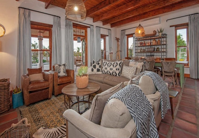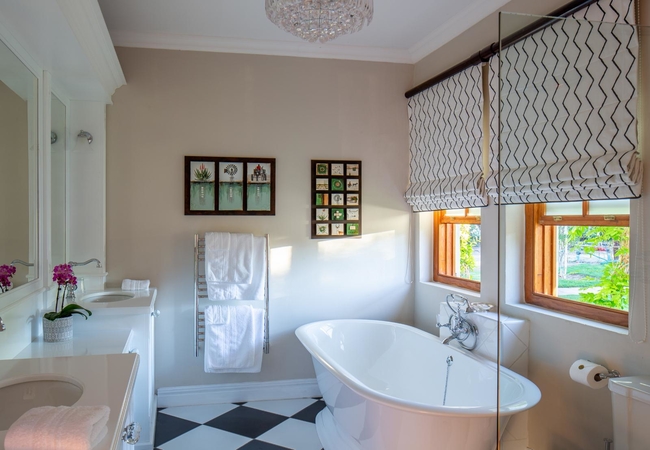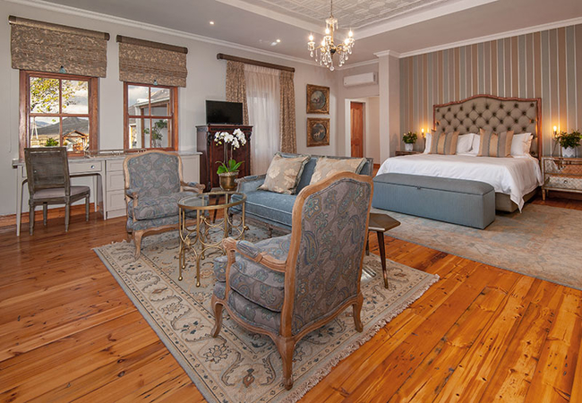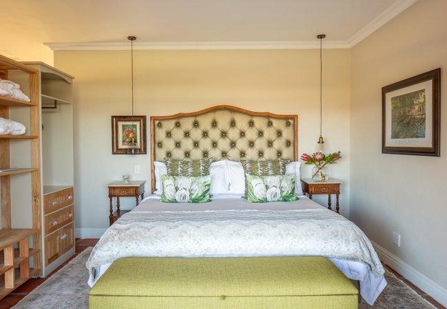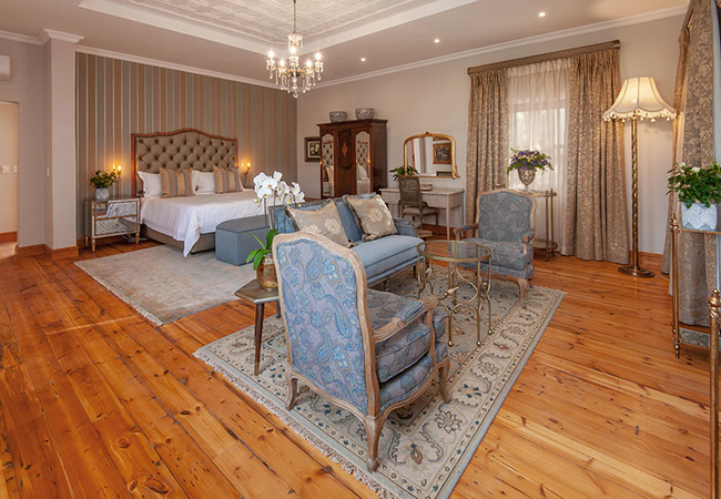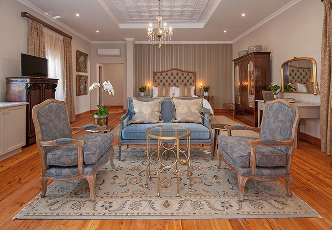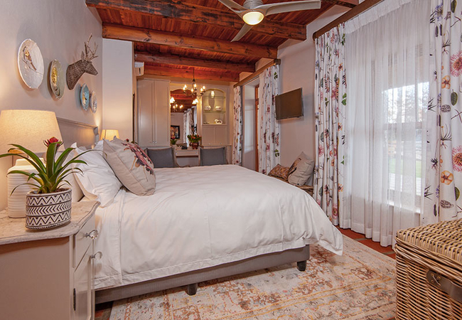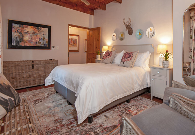 The Orchard Room is furnished with a king-size bed and a sitting area with a reading lamp. The en-suite bathroom is fitted with a bath, shower, toilet and basin. There is a coffee station with a kitchen basin, a bar fridge, a television set with DStv, a ceiling fan and air-conditioner, underfloor heating and Persian carpets.