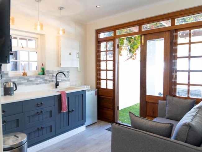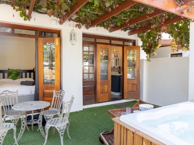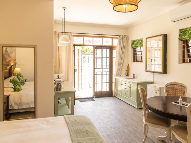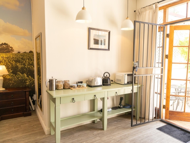 Simonsberg Studio is attached to the sophisticated Cape Georgian manor and offers accommodation for up to two guests. The studio features a king-size bed and an en-suite bathroom with a toilet, basin, and shower. It also includes a kitchenette equipped with a bar fridge, microwave, and tea- and coffee-making facilities. Additional amenities consist of a private entrance, a TV, and a small braai on the patio.