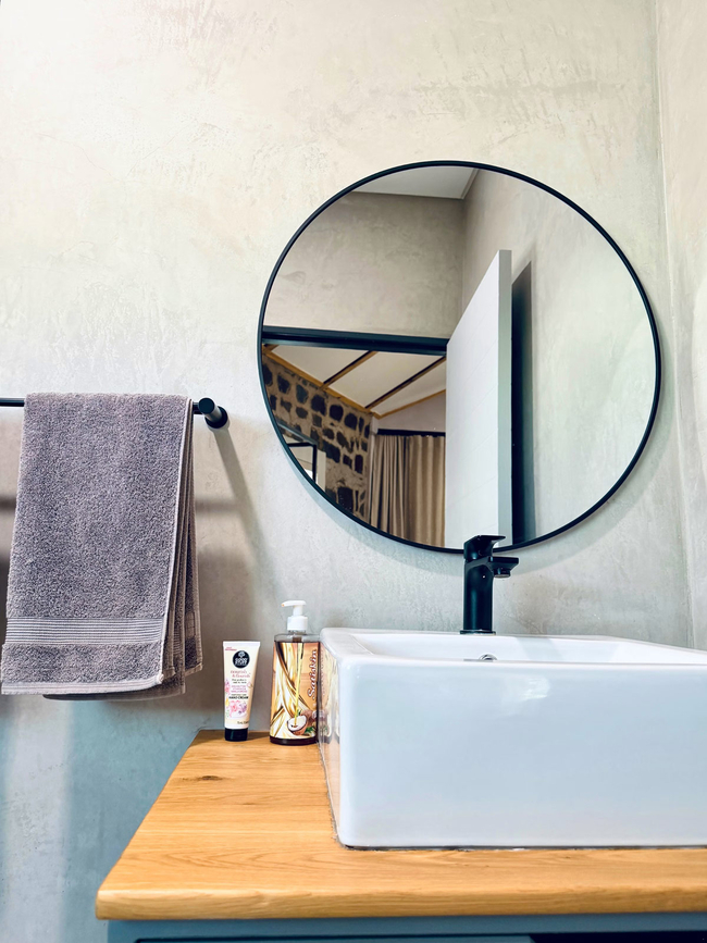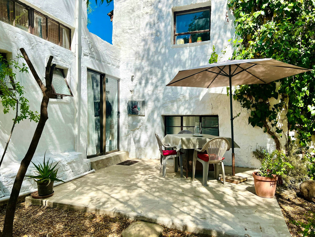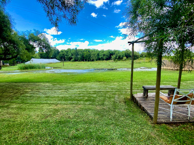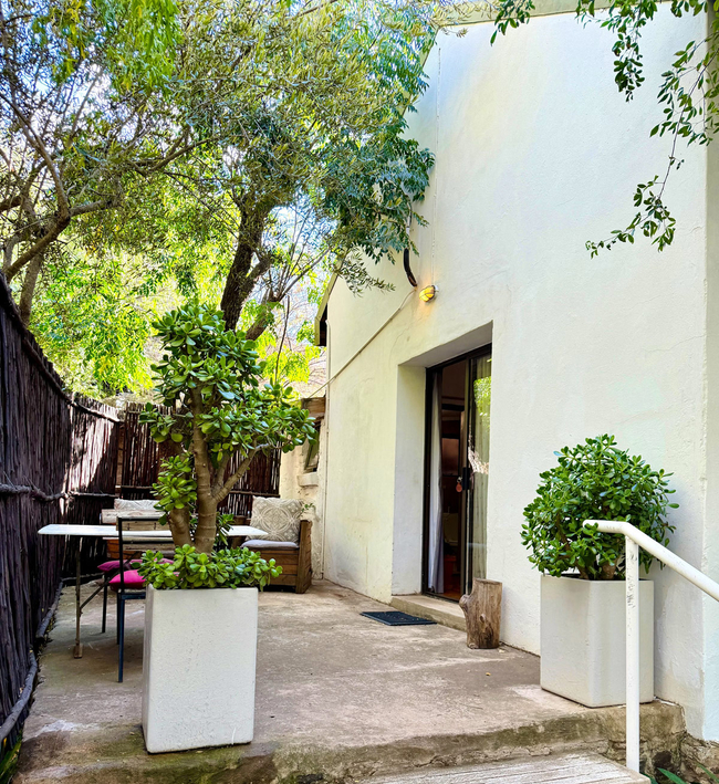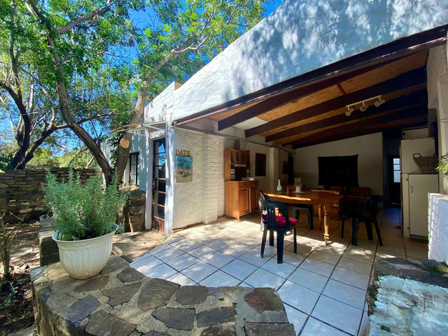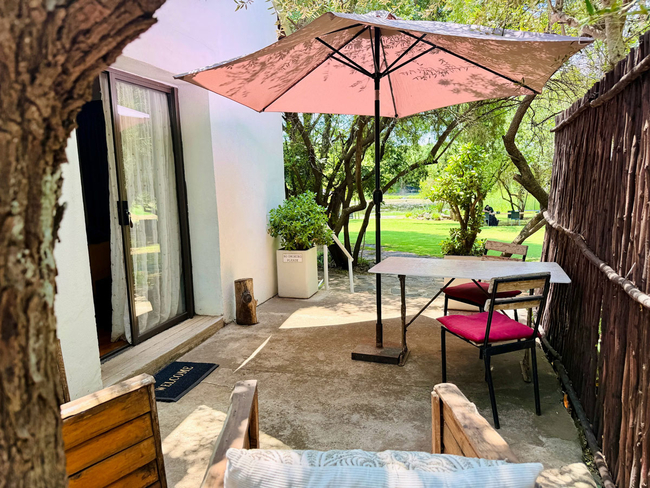 Outside, a private patio opens onto the garden, where guests can enjoy a peaceful setting complete with an outdoor dining area and braai facilities, ideal for relaxed family meals.