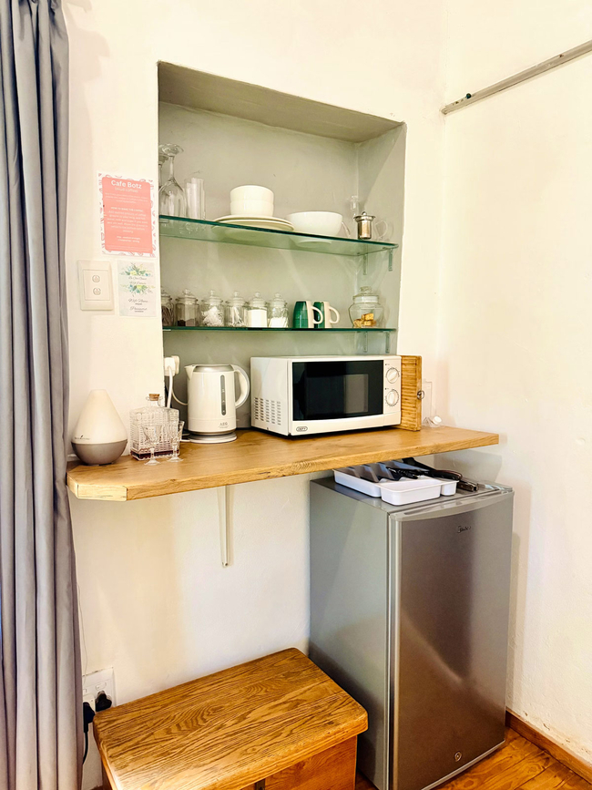 The en-suite bathroom is equipped with a shower, hairdryer, and fresh towels. A practical kitchenette provides a bar fridge, microwave, toaster, and coffee and tea-making facilities, making light self-catering simple and convenient.