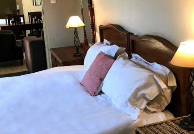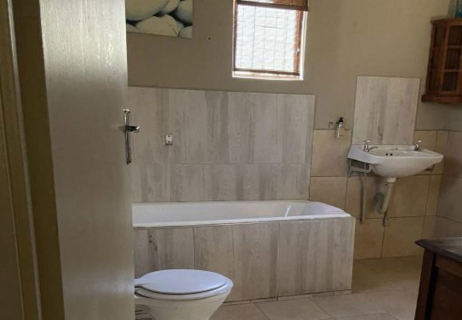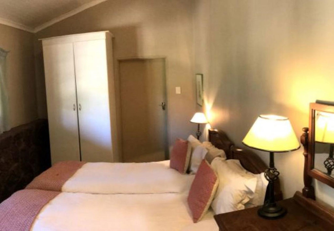 Kingfisher Cottage in Modimolle offers standard accommodation in its four bedrooms that all lead off from the main living area. To the left are two bedrooms, the main room is furnished with a King-sized bed, while the other is furnished with two single beds. These bedrooms have access to a shared private bathroom fitted with bath, basin and toilet. Opposite are two bedrooms furnished with King-size beds, percale linen and their own private en suite bathrooms fitted with a shower, toilet and basin.