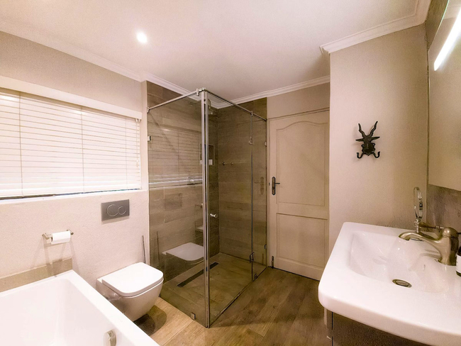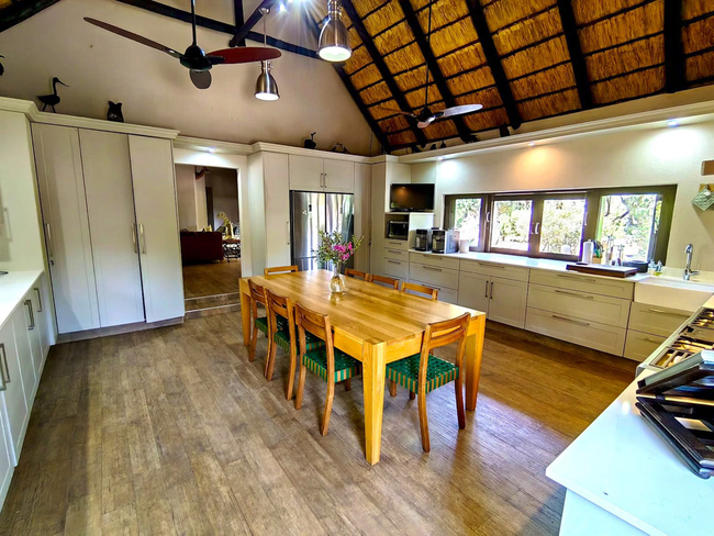 Designed to accommodate up to 14 guests, the lodge features seven generously sized, air-conditioned bedrooms. Within the main house are two refined suites, one appointed with a king-size bed and a full en-suite bathroom comprising a bath, shower, basin, and toilet; the other with a queen-size bed and a similarly equipped en-suite. The remaining five rooms are housed in separate chalets, each offering its own en-suite bathroom. These chalets feature a variety of sleeping arrangements, including double, queen, and twin beds, ideal for couples, families, or friends travelling together. High-quality linen and towels are provided for added comfort. At the centre of the home lies a fully equipped kitchen, complete with a gas stove, fridge-freezer, oven, microwave, coffee machine, and dishwasher—ensuring that preparing meals is both convenient and enjoyable. A large central dining table invites guests to gather and share meals in a warm, convivial setting. Adjacent to the kitchen is a spacious open-plan lounge fitted with plush seating, a television, and a built-in bar (unstocked). A second, more intimate lounge area features a wood-burning fireplace, perfect for relaxing on cooler evenings. Complimentary Wi-Fi is available throughout the lodge. Outdoor living is just as thoughtfully considered. Guests can unwind beside the swimming pool on sun loungers or enjoy evenings under the stars in the traditional open-air boma, complete with a fire pit, braai, and pizza oven—ideal for long, laughter-filled nights in the bush. Secure parking is available on site.