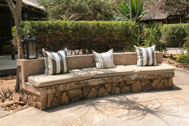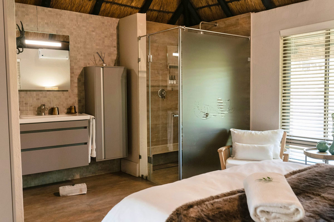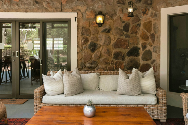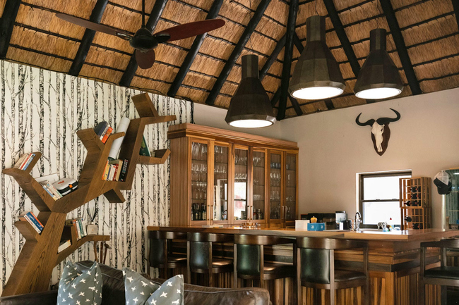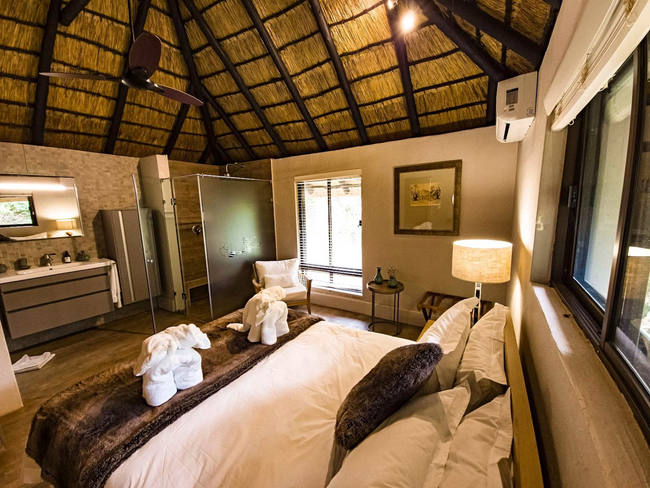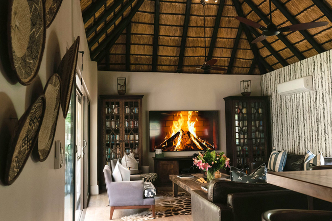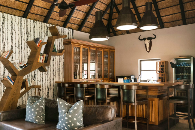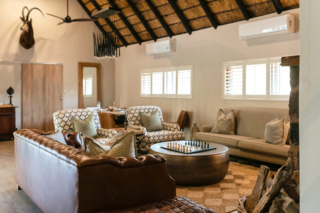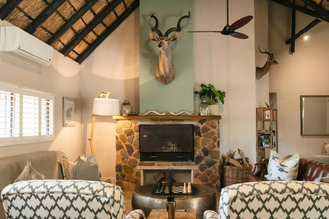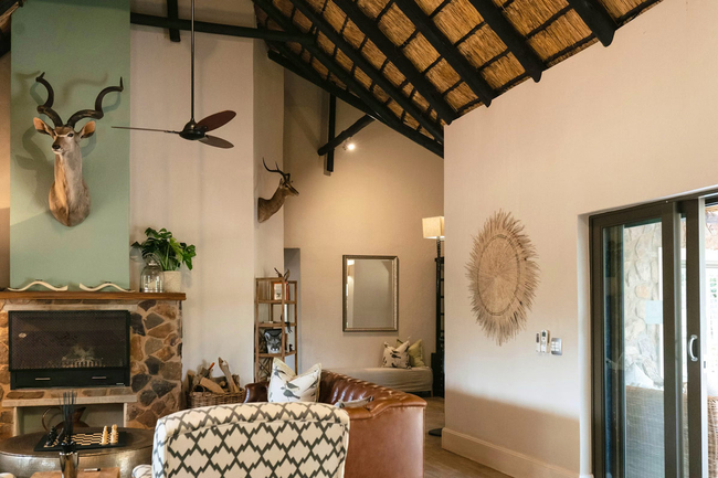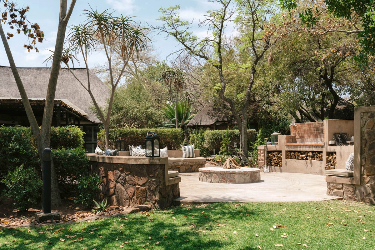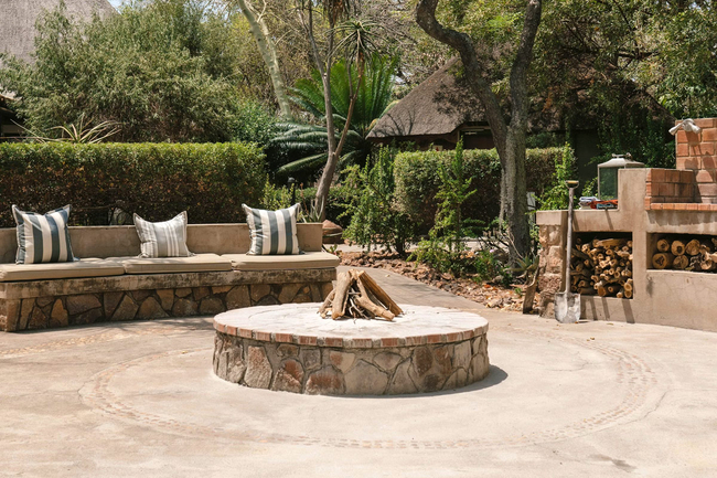 Outdoor living is just as thoughtfully considered. Guests can unwind beside the swimming pool on sun loungers or enjoy evenings under the stars in the traditional open-air boma, complete with a fire pit, braai, and pizza oven, ideal for long, laughter-filled nights in the bush. Secure parking is available on site.