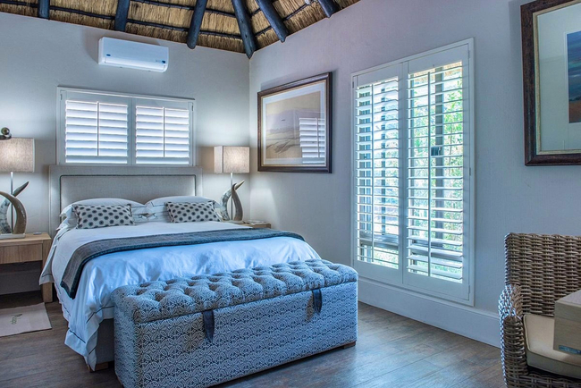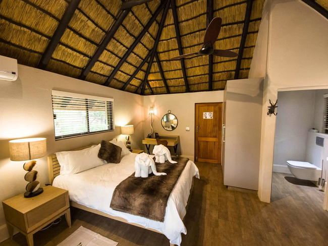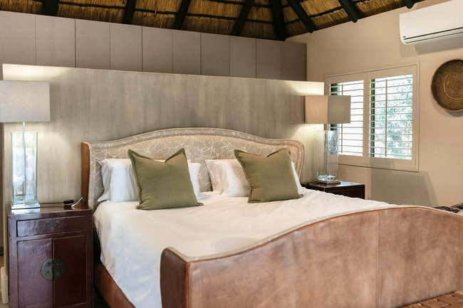Designed to accommodate up to 14 guests, the lodge features seven generously sized, air-conditioned bedrooms. Within the main house are two refined suites, one appointed with a king-size bed and a full en-suite bathroom comprising a bath, shower, basin, and toilet; the other with a queen-size bed and a similarly equipped en-suite.