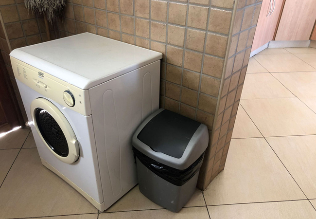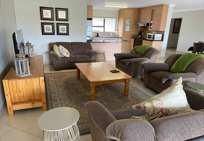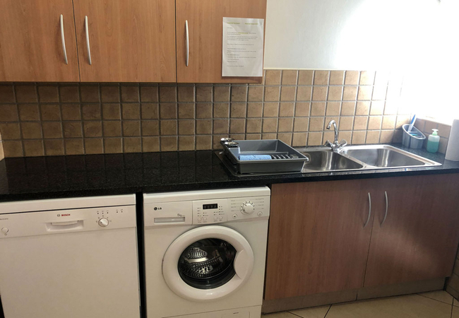The kitchen overlooks the living area, and is fully self catering with granite counters, under-counter oven, glass top hob, fridge/freezer, microwave, and other appliances. From the kitchen, there is a scullery complete with dishwasher, washing machine, tumble drier, and wash-up area.