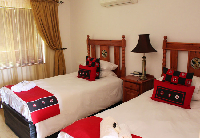 Each room has either a double or two single beds with en-suite bathrooms, only with showers. Rooms have air-conditioning, DStv, and wireless Internet. The room is equipped with tea and coffee facilities. The rooms also include a hairdryer and blankets.