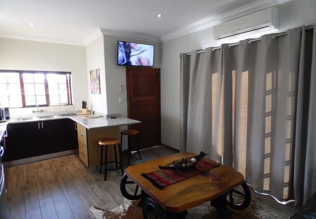 The One Bedroom Flat has a room with a Queen-size bed and an en-suite bathroom. There is a fully equipped kitchen and a TV with DStv / satellite channels. The units are all air conditioned and the rooms are fitted with ceiling fans. Each unit has its own deck upstairs which houses the BBQ area and outdoor seating. Downstairs each unit has a lovely splash pool, sun deck, pool loungers, seating area and gazebo.