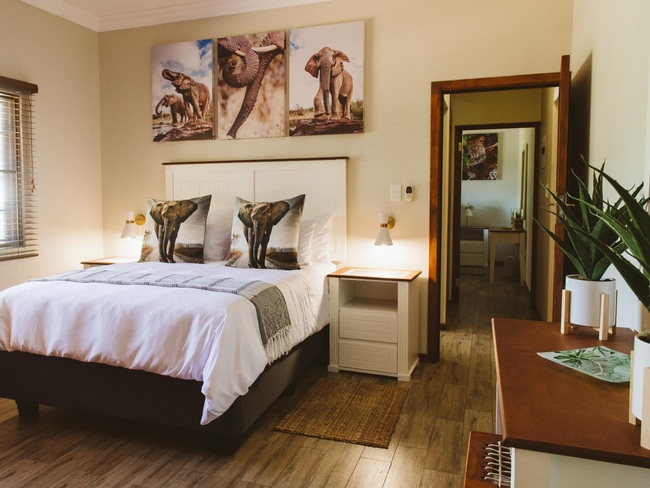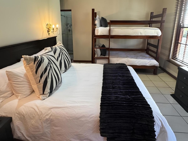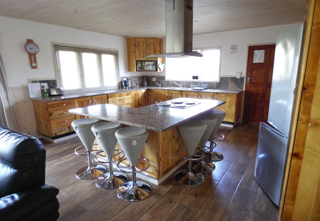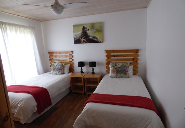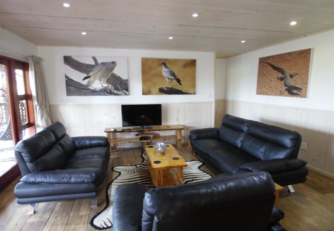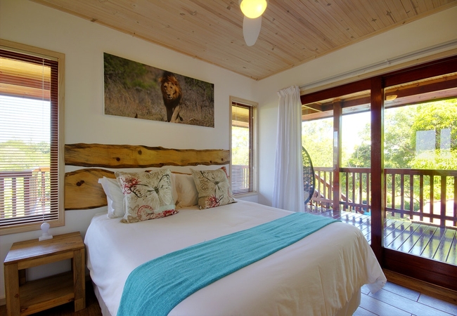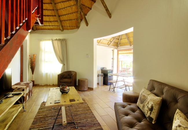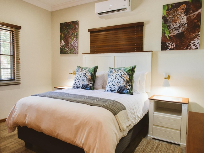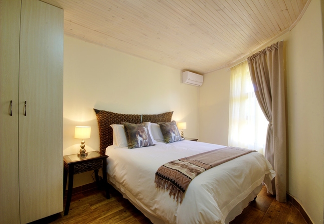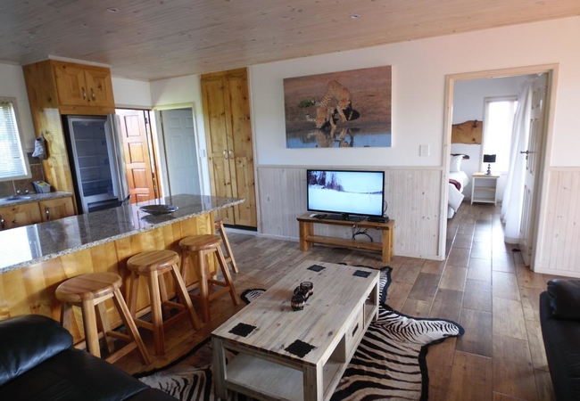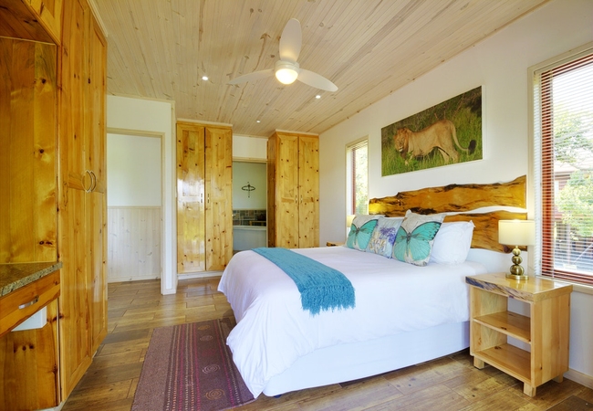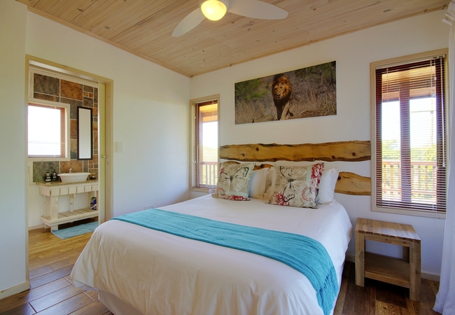 This cabin has three bedrooms. The main bedroom has a double bed with an en-suite bathroom. The other two rooms have two single beds each and share a bathroom. There is a fully fitted kitchen, a flat screen TV, air-conditioning, braai facilities and a private splash pool with a sun deck and lapa.
