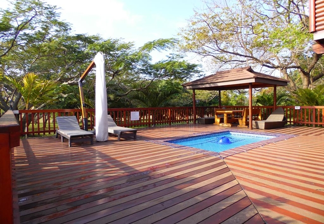 The bungalow has a thatched roof, a private swimming pool and braai / bbq area. The units are all air conditioned and the rooms are fitted with ceiling fans. Each unit has its own deck upstairs which houses the BBQ area and outdoor seating. Downstairs each unit has a lovely splash pool, sun deck, pool loungers, seating area and gazebo.