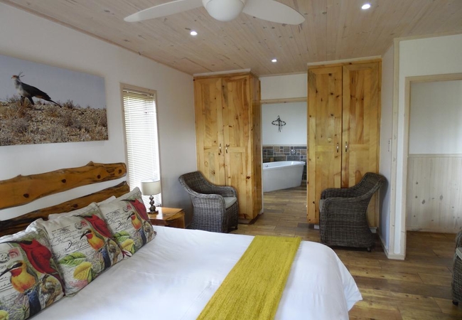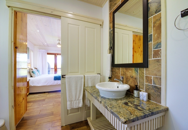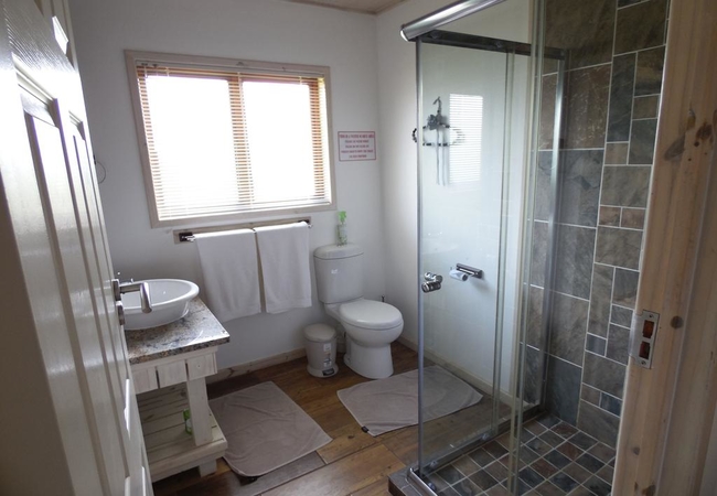 This cabin has two bedrooms. The main bedroom has a double bed and an en-suite bathroom. The second bedroom has two single beds and an en-suite bathroom. There is a fully fitted kitchen, a flat screen TV, air-conditioning, braai facilities and private splash pool with sun deck and lapa.