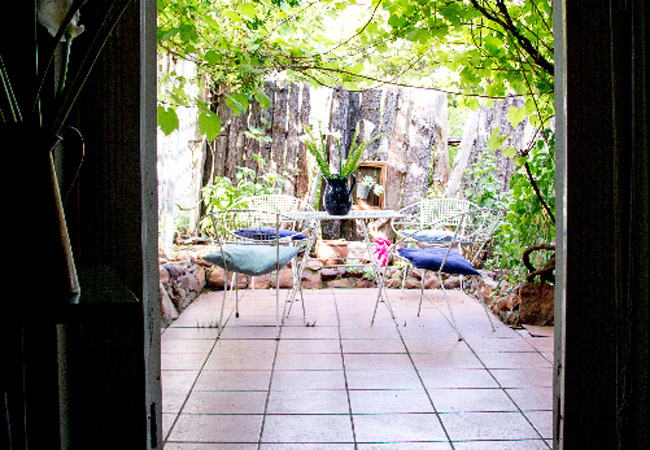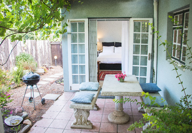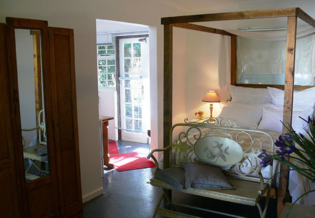 This room has a four poster double bed, space for extra mattress / baby cot and en-suite bathroom with a bath and shower. The kitchenette has a table, chairs, fridge, microwave and electric frying pan. There is a private patio with braai facilities.