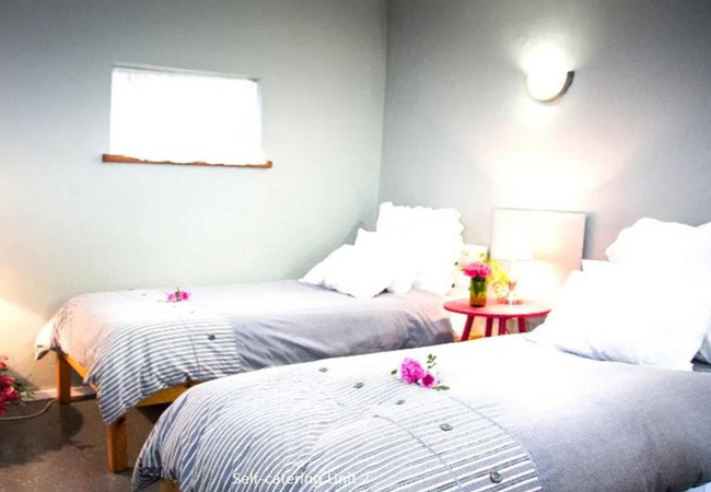 This unit has twin beds and en-suite bathroom with a shower. There is space for an extra mattress / cot for child. The kitchenette has a table, chairs, fridge, microwave and electric frying pan. There is a private patio with braai facilities.