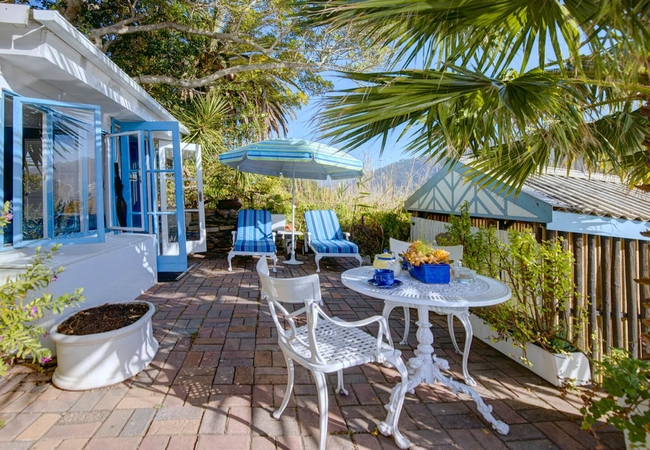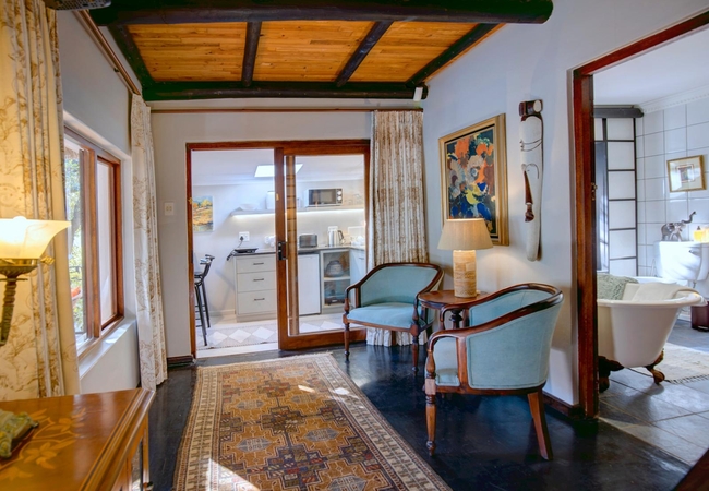 Stone Cottage is a century-old stone and thatch dwelling, furnished with antiques and Egyptian-themed artworks, the two-bedroomed stone cottage is spacious and private; ideal for a family of four. The main bedroom (above) has French doors that open onto the large private courtyard, with comfortable seating and water feature under one of the large Milkwoods. The second bedroom has twin beds and its own entrance off the patio as well as off the shared bathroom; a large picture window overlooks a succulent and aloe garden. Bathroom is also under thatch and comprises a Victorian slipper tub, shower and double basins. Both bedrooms enjoy direct access to the bathroom. Large semi-private seating area shaded by the 400-year-old milkwood tree and screened off by timber and potted plectranthus - spectacular when in full bloom.