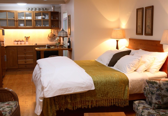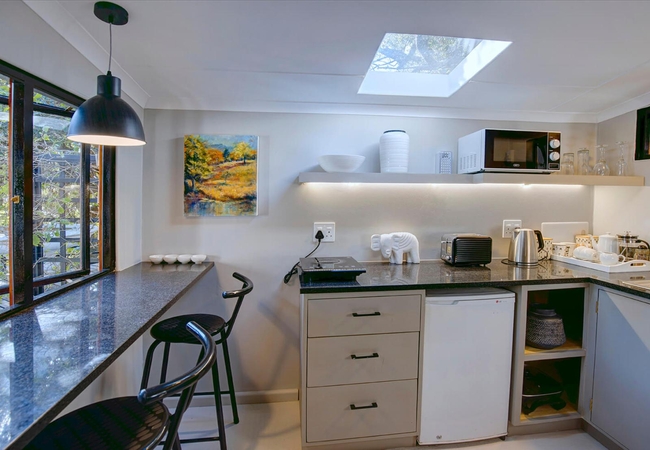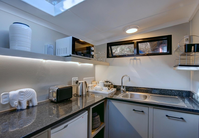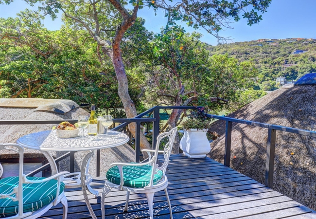 Kingfisher is a compact one-bedroom unit furnished with a King-size bed and an en-suite bathroom fitted with a shower, toilet and basin. There is a well-equipped kitchenette. Doors open onto the elevated deck, furnished with table and chairs, with lovely views of the milkwoods, estuary and forested riverbanks opposite.