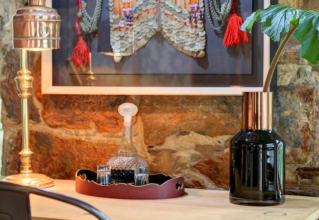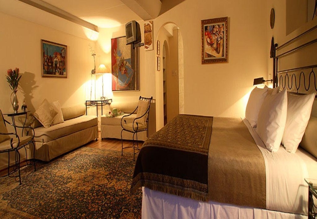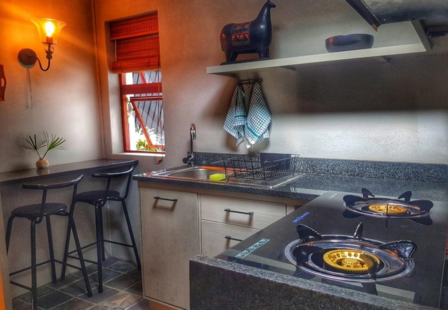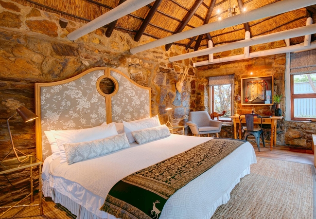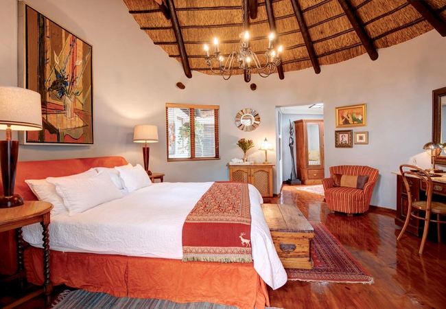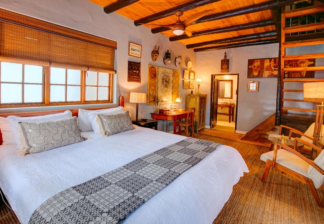 Shaded by a 400-year-old Milkwood tree, this richly decorated double-level thatched cottage can potentially sleep five. The main bedroom has a king-size bed looking out onto your private alcove. Bathroom is large (bath and separate shower) and splendidly appointed, with large cupboard space. Your private seating alcove, shaded by a 400-year-old Milkwood tree. The upstairs bedroom, right under the thatch, is also richly decorated with kelims; note that the upstairs double bed is low (to fit under the eaves) so not suitable for the elderly traveller.