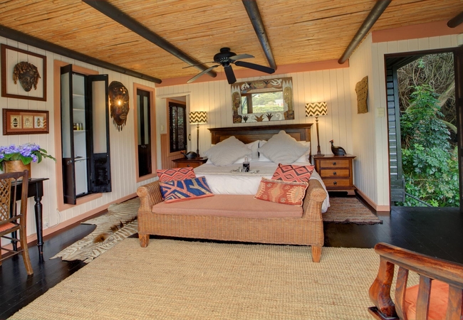 Moondance is under a gorgeous thatch canopy, with dressing anteroom linking the bedroom and bathroom. As with most of the rooms the king-size bed can be made into twins if needed. The bathroom features both high-pressure shower and corner tub. The outside seating area is the least private but has river views and is shaded by a magnificent milkwood.