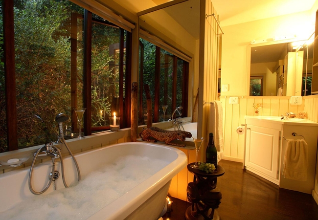 This delightful double bedded room enjoys an excellent view of the Touw River and surrounds. Ideal for honeymoon couples. Bedroom leads onto sun filled patio, en-suite bathroom with an outside private deck complete with hot and cold shower. A timber treehouse built on stilts, with sliding doors opening onto a private terrace with wonderful elevated views of the lagoon and verdant hillsides of Wilderness from your queensize bed. Entrance is via a staircase that winds through the bush. Luxuriate in the green reflections of the indigenous bush that surrounds you, so close you can literally reach out and touch it from your bath. There's nothing like showering in the great outdoors - come rain or shine: totally private; totally refreshing. Step out onto your terrace, and you see why this suite is called Treetops. Furnished with timber chairs and comfortable loungers from which to enjoy the views.