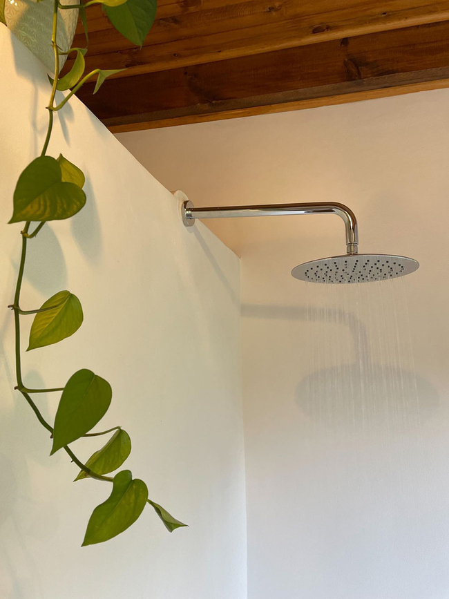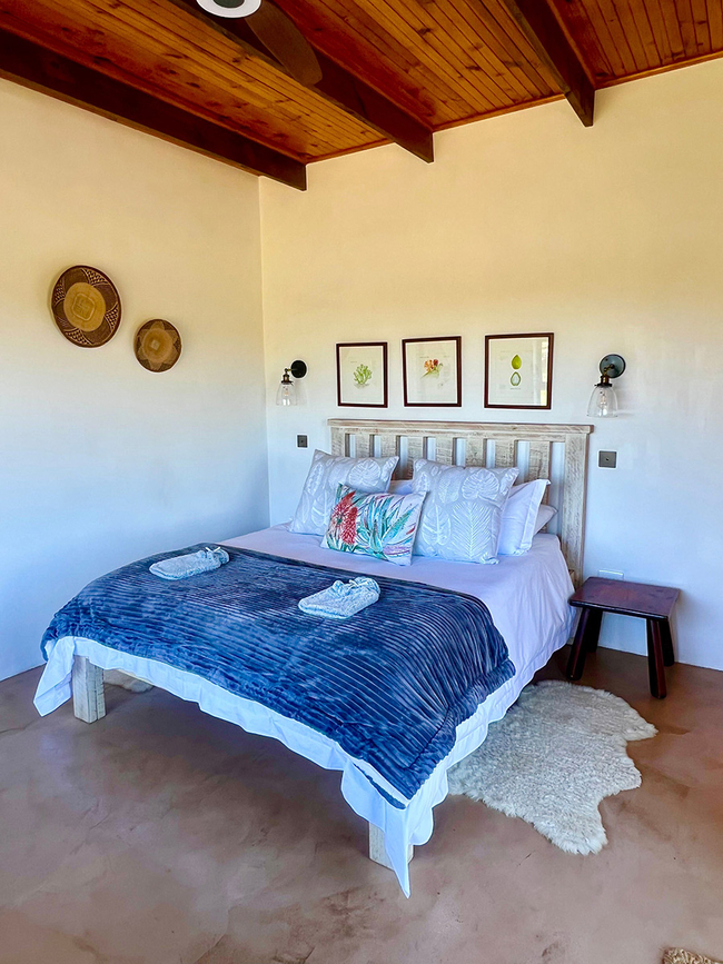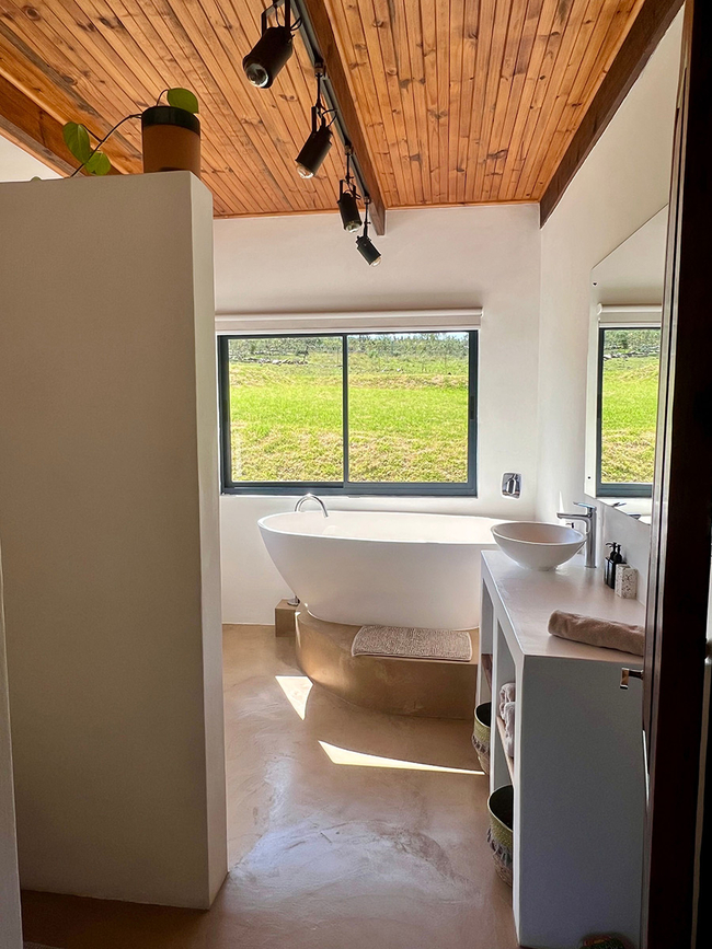 Morado Cottage has one bedroom furnished with a Queen-size bed. The private bathroom is fitted with a freestanding bath, shower with views from the large windows, toilet and basin.